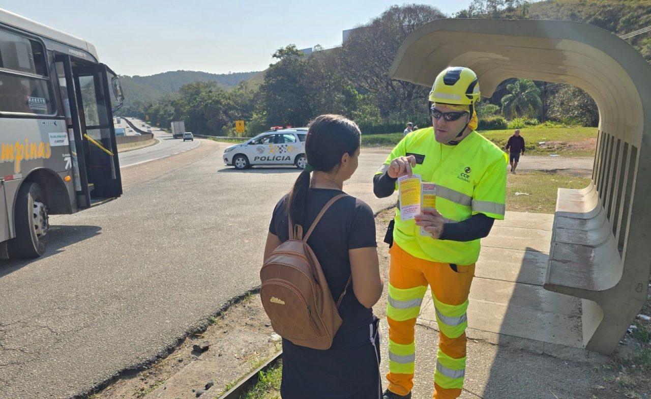 A equipe de operação distribuiu panfletos e passou orientações, tais como atravessar sempre nas passarelas, e/ou outros dispositivos de travessia como ponte, viaduto ou passagem sob a rodovia e atravessar apenas em locais sinalizados usando calçadas e escadas que facilitem esse acesso.