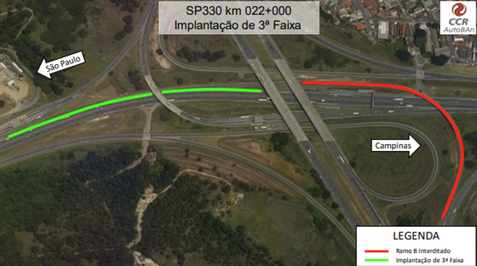Para garantir maior fluidez e alívio no volume diário de veículos, aumentando a segurança e conforto dos clientes, a CCR AutoBAn está em processo de implantação da 3ª faixa de rolamento entre o Km 21 e 23, pista norte e sul da SP330. Nesta etapa, para execução das obras, está sendo realizada a interdição completa da alça de saída do Rodoanel Mário Covas (SP-021), pista externa, para a Rodovia Anhanguera (SP-330), sentido São Paulo.
