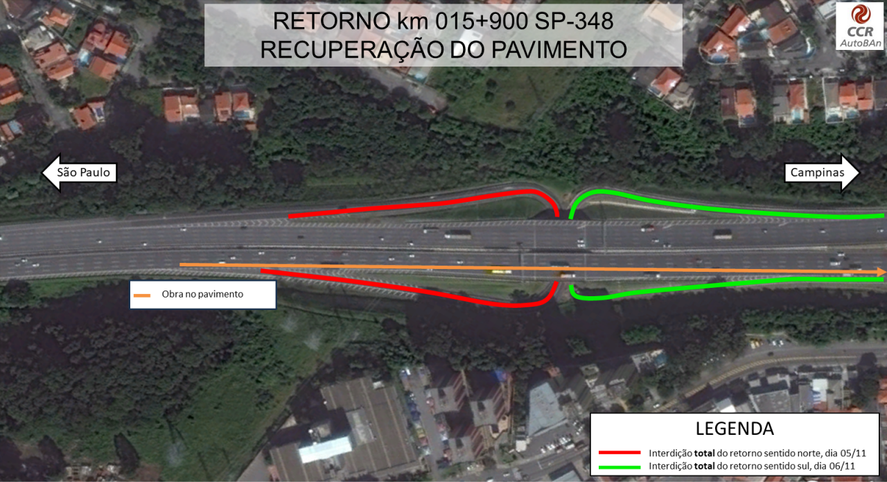 Para as obras no dia 05, será preciso a interdição do acesso da pista norte (interior) com saída para a pista sul (capital) no viaduto localizado no km 15+900. No dia 06, os trabalhos estarão mais avançados na rodovia e a previsão é de interdição do sentido sul para a saída no sentido norte no mesmo dispositivo.