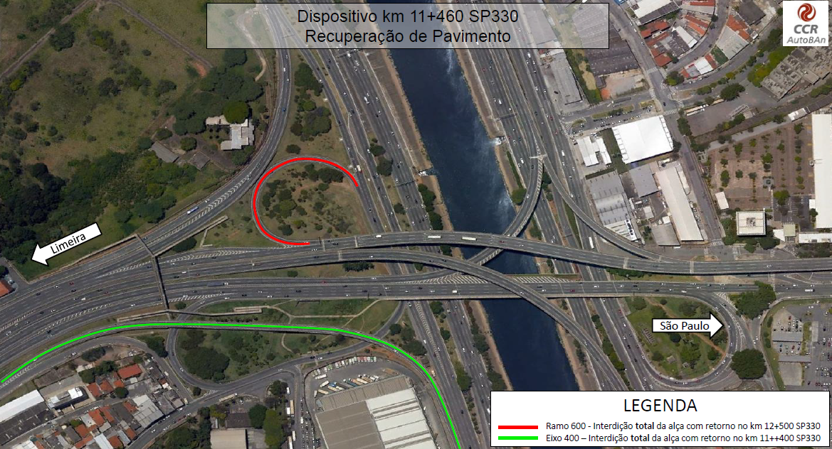 A Rodovia Anhanguera (SP-330) está passando por uma obra de implantação da 3ª faixa de rolamento entre o km 21 e km 23, pista norte e sul, São Paulo. Para execução dos trabalhos, está sendo realizada a interdição completa da alça de saída do Rodoanel Mário Covas (SP-021), pista externa, para a SP-330, sentido São Paulo.