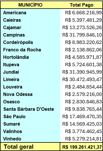 O repasse foi feito para as cidades de Americana, Caieiras, Cajamar, Campinas, Cordeirópolis, Franco da Rocha, Hortolândia, Itupeva, Jundiaí, Limeira, Louveira, Nova Odessa, Osasco, Santa Bárbara D’Oeste, São Paulo, Sumaré, Valinhos e Vinhedo. Desde o ano 2000, quando começaram os repasses, já foram destinados mais de R$ 4 bilhões a esses municípios, servindo como um valioso incremento de caixa à administração pública.