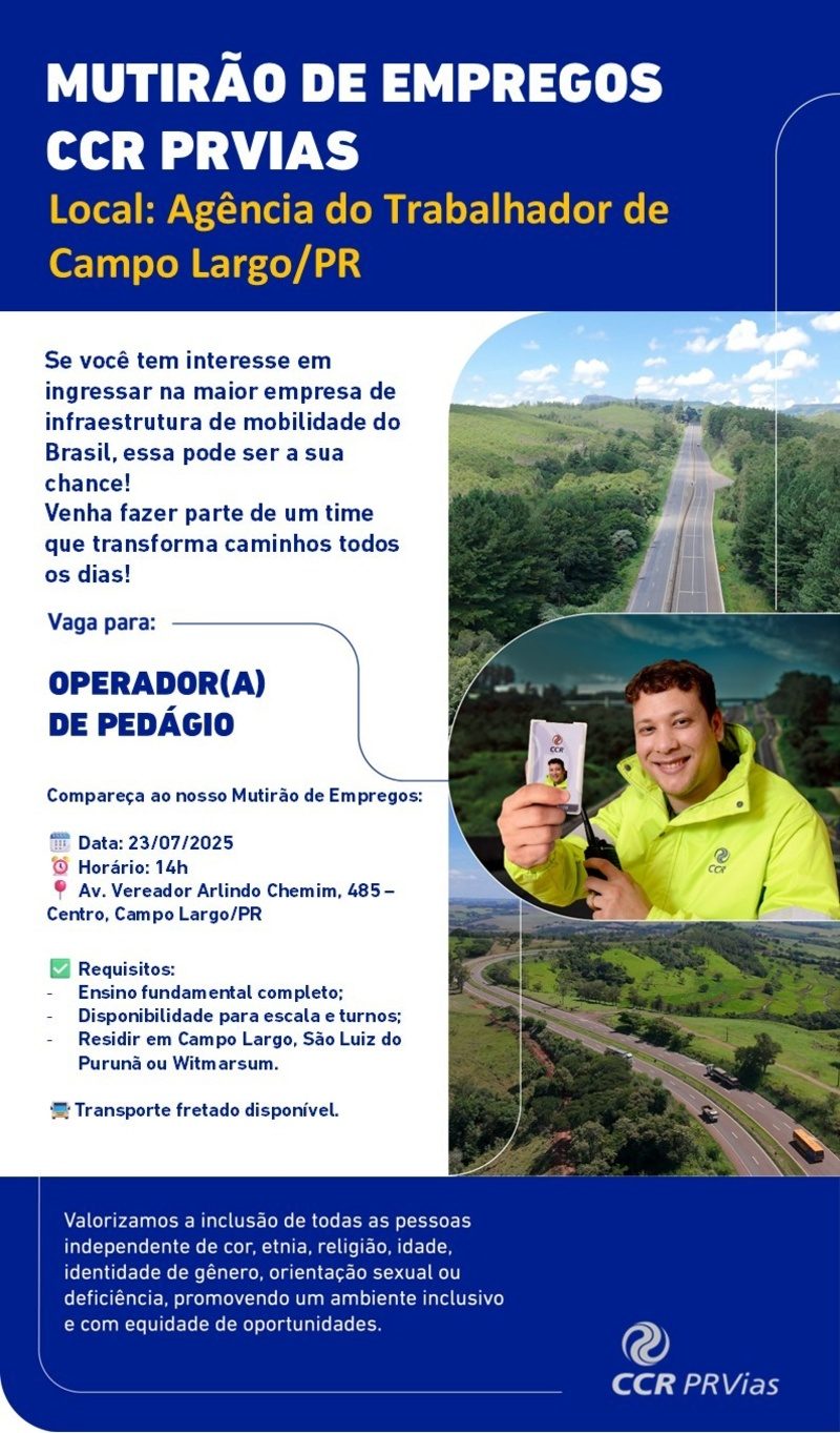 A PRVias, uma empresa Motiva, promove nesta quarta-feira (23) um mutirão de empregos, em Campo Largo (PR), para contratação de operadores de pedágio. São dez vagas abertas e também cadastro de banco de talentos para contratação em novas oportunidades.