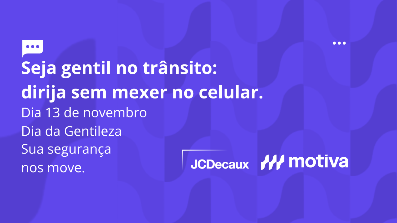 Em continuidade às ações da campanha “Sua segurança nos move”, que tem o objetivo de tratar o tema da epidemia da distração, causada por quem dirige e mexe ao celular ao mesmo tempo, Motiva e a JCDecaux, líder global em mídia Out-of-Home (OOH), seguem com as ações de orientação sobre os riscos desta prática no trânsito.