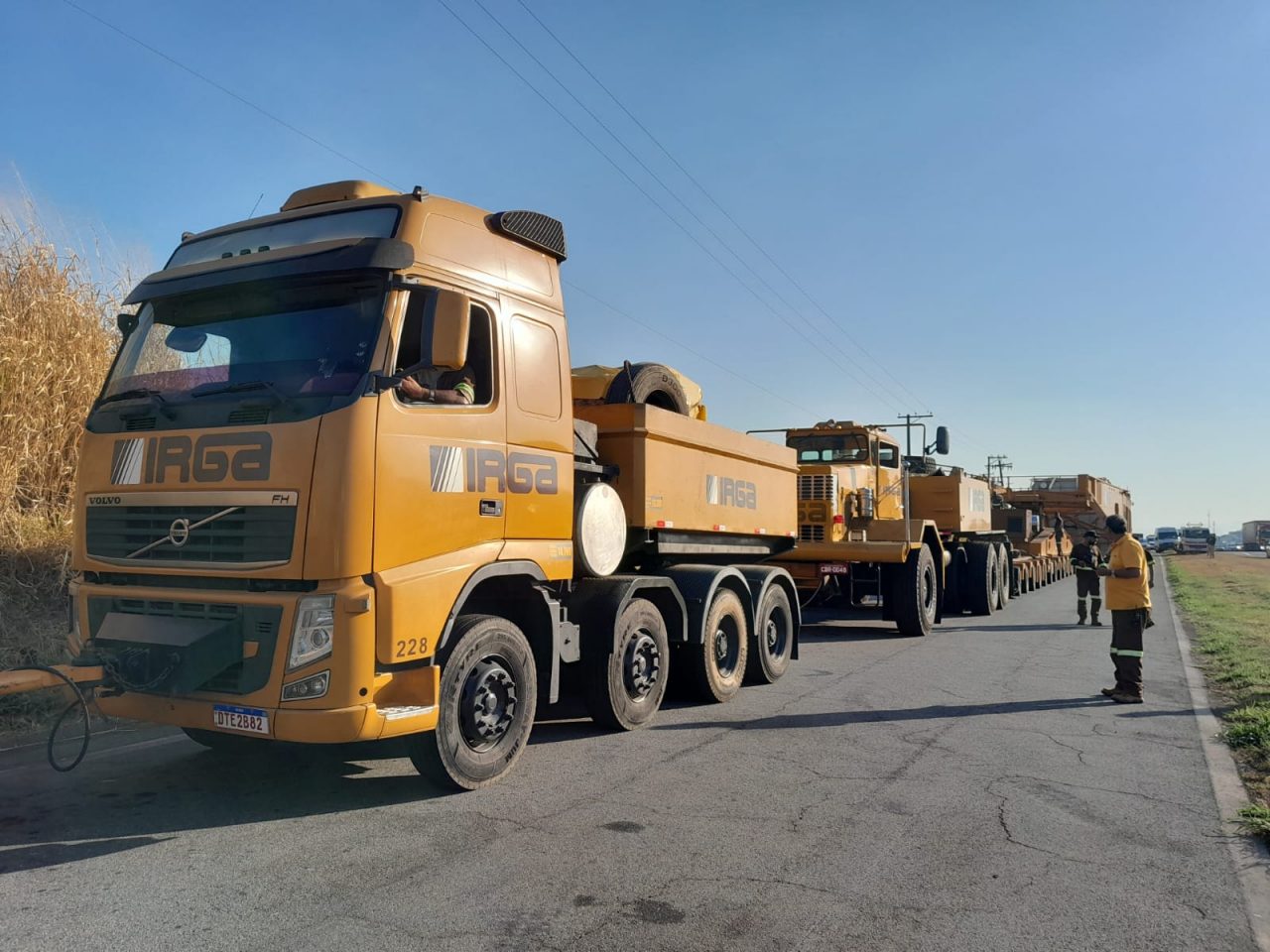 O conjunto transportador com 106 metros de comprimento, mais de 6 metros de largura e peso total de 647 toneladas, segue em deslocamento pela Via Dutra (BR-116) rumo ao Porto de Itaguaí (RJ).