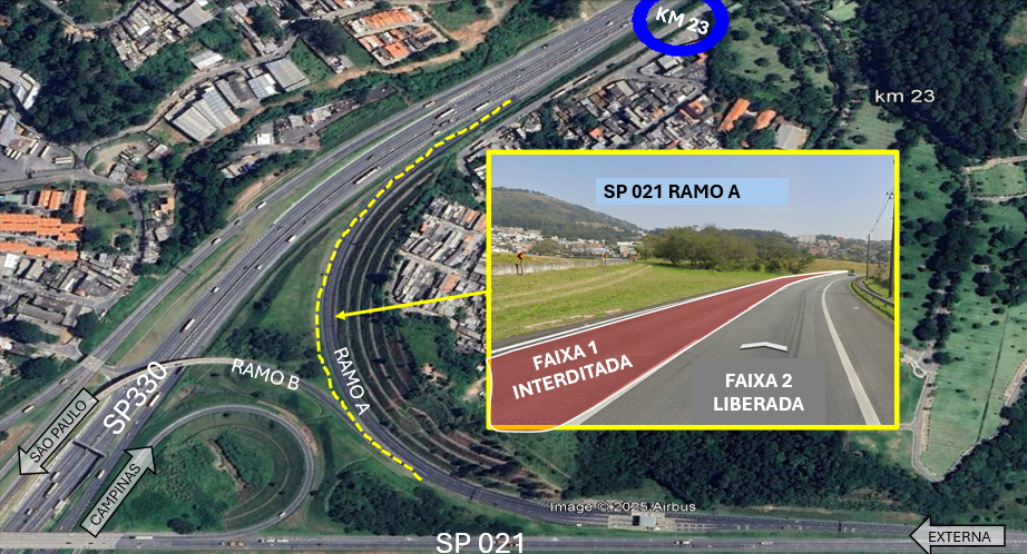 A CCR AutoBAn vai interditar a faixa 1 (esquerda) do Ramo A, km 06, pista externa do Rodoanel Mário Covas (SP-021), na alça de acesso à Rodovia Anhanguera (SP-330), km 22+750, pista Norte (interior).