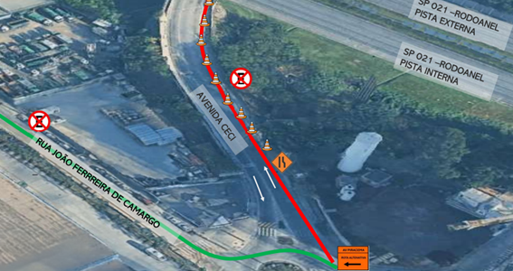 As equipes de tráfego e engenharia da concessionária irão providenciar o fechamento fixo da faixa 2 (faixa da direita), com cones de sinalização, e instalarão placas de orientação do tráfego, incluindo rota alternativa para quem segue sentido Tamboré, pela avenida João Ferreira de Camargo.
