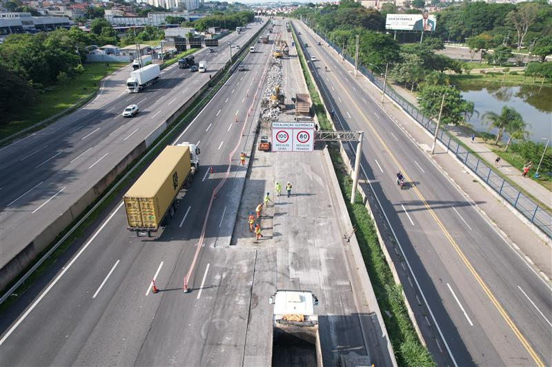 Para realização da obra da faixa adicional, será necessário a interdição da faixa 01 (esquerda) entre os km 3 ao 6+500 até o dia 20/06/2026, 24 horas. Como medida compensatória para não impactar a fluidez no local, está sendo disponibilizado o uso do acostamento ao tráfego do km 3+500 ao km 4+900, pista externa, absorvendo assim, o fluxo oriundo da Rodovia dos Bandeirantes (SP-348), pista Sul (capital).