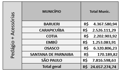 A determinação do valor leva em consideração a extensão territorial dos municípios cortada pela rodovia concessionada. O Rodoanel faz esse repasse aos 07 municípios cortados pelas rodovias do Rodoanel Mário Covas, trecho oeste.