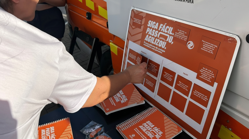 Em seguida, os participantes são convidados a interagir em uma dinâmica educativa “Verdadeiro ou Falso”, utilizando uma lousa imantada para classificar informações sobre o pedágio eletrônico. A atividade tem caráter informativo e lúdico, e ao final da atividade os participantes recebem um caderno informativo produzido pela concessionária, que reúne as principais orientações sobre o sistema e funciona como um guia para consulta posterior.