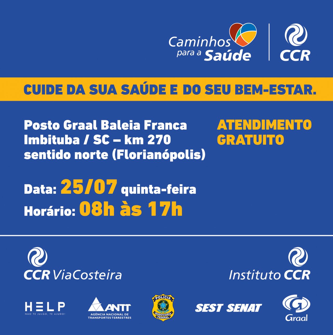 Para comemorar o Dia do Motorista e Motociclista, celebrado nos dias 25 e 27 de julho respectivamente, a CCR ViaCosteira oferecerá nesta quinta-feira (25) check-up de veículos e serviços de saúde gratuitos para os motoristas, profissionais do volante e motociclistas que passarem pela rodovia BR101sul/SC. A ação do Programa Caminhos para a Saúde, do Instituto CCR, será realizada pela equipe multidisciplinar da concessionária e instituições parceiras, que farão aferição da pressão arterial, testes de glicemia e colesterol, massagem circulatória e apoio à saúde emocional. Além disso, serão oferecidos serviços gratuitos de barbearia e corte de cabelo.