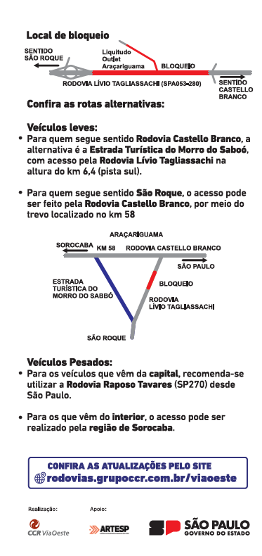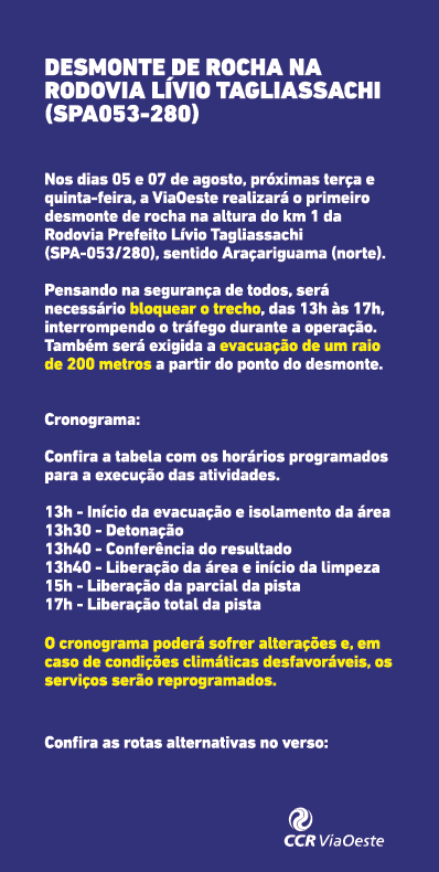 A ViaOeste informa que, com o avanço das obras de duplicação da Rodovia Lívio Tagliassachi (SPA-053/280), será realizada mais uma etapa de desmonte de rochas no trecho localizado na altura do km 1, pista norte (sentido rodovia Castello Branco), no município de São Roque. A operação ocorrerá nos dias 05 e 07/08 (terça-feira e quinta-feira), com bloqueio total da pista durante a execução das atividades.