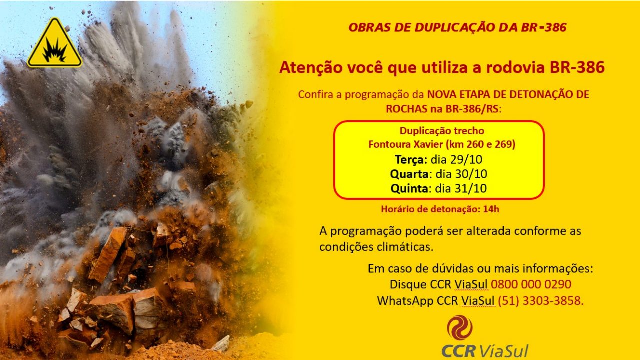 A CCR ViaSul divulga a programação de detonações de rochas previstas para a BR-386/RS. Conforme a Concessionária, serão três intervenções durante esta semana, sendo nos dias 29 (terça), no km 260 e nos dias 30 e 31 (quarta e quinta), no km 269, em Fontoura Xavier. Todas as ações iniciam as 14h.