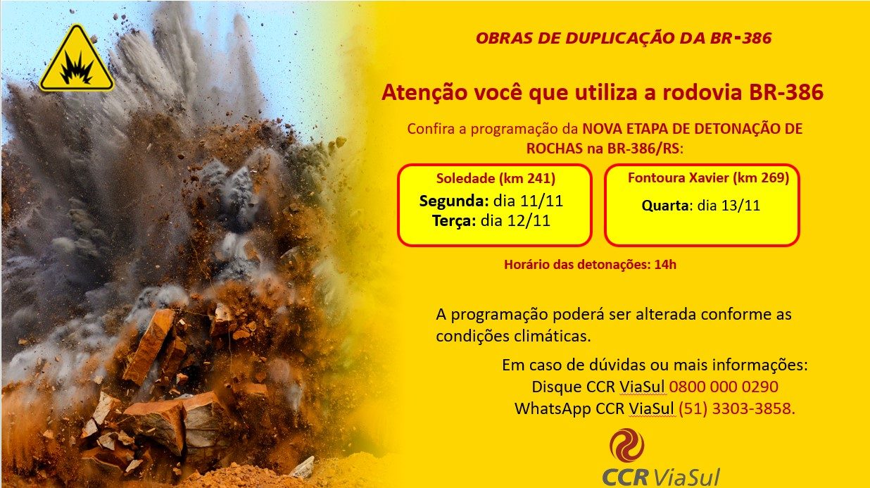 Nesta segunda (11), a CCR ViaSul divulga a programação prevista de detonações para a BR-386/RS. Conforme a Concessionária, as intervenções acontecerão na segunda e terça (11 e 12), no km 241 em Soledade; e na quarta (13), no km 269, em Fontoura Xavier. Todas as ações iniciam as 14h.