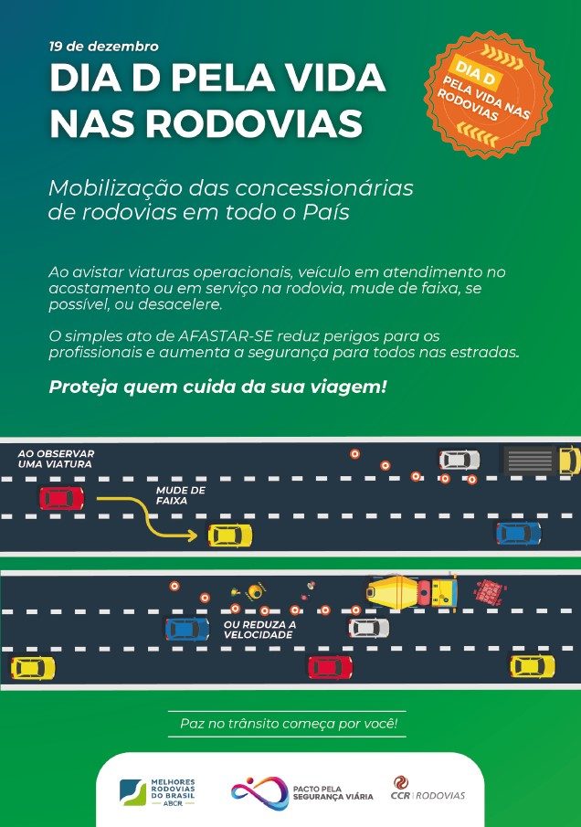 O Movimento Afaste-se é uma iniciativa criada pelo Grupo CCR e coordenada pela ABCR com o objetivo de conscientizar motoristas sobre a prevenção de acidentes envolvendo viaturas em atendimento, colaboradores realizando manutenção e áreas com obras. As orientações são simples, mas têm o poder de salvar vidas: sempre que se deparar com um atendimento em pista ou alguma atividade em que existam pessoas trabalhando às margens da rodovia, o condutor deve reduzir a velocidade e, sempre que possível, trocar de faixa.