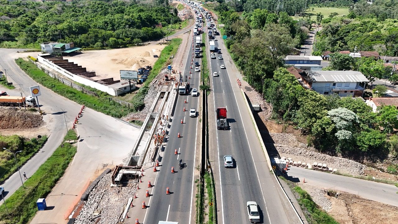 A partir das 9h deste sábado (14), a CCR ViaSul informa que realiza operação de içamento de vigas no viaduto da ferrovia, na região do km 350 da BR-386 em Estrela (RS). A atividade deve seguir até as 16h com restrição de uma faixa na pista Norte (sentido interior) da rodovia, enquanto na Rua Octávio M. Gorgen, abaixo da rodovia, segue o bloqueio total.