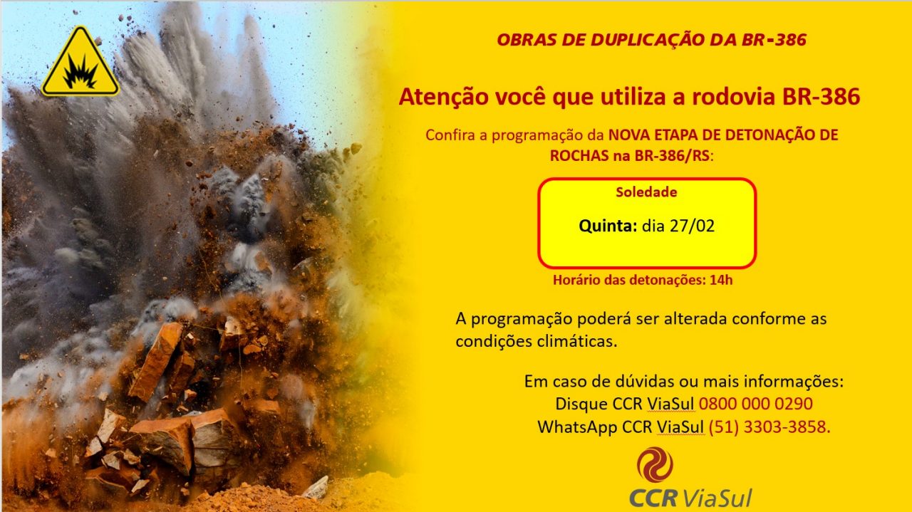 A CCR ViaSul realiza nesta quinta (27) mais uma etapa de detonação de rochas na BR-386, na região do km 229 em Soledade (RS), às 14h.