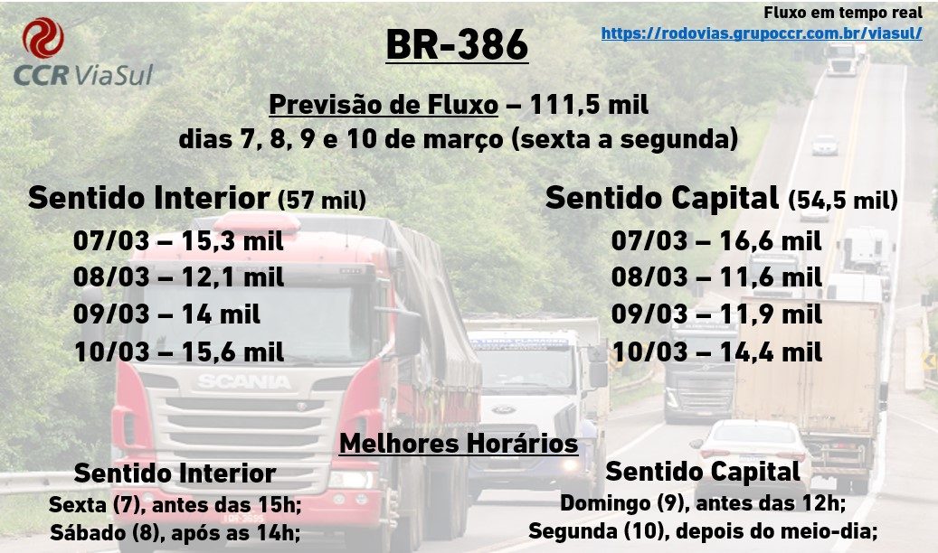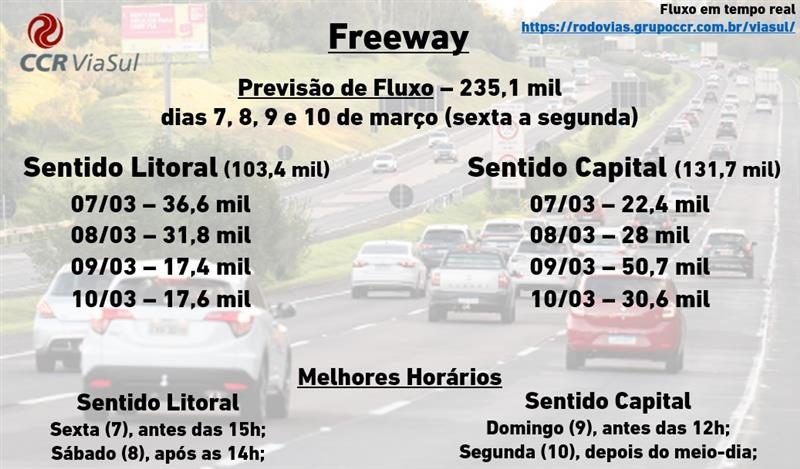Em divulgação da última previsão de fluxo para o período da Operação Verão, a CCR ViaSul informa que estão previstos quase 800 mil veículos entre os dias 7 e 10 de março (sexta a segunda), utilizando suas rodovias. Deste total, a empresa espera que, só pela Freeway, circulem pouco mais de 235 mil motoristas, dos quais 103 mil seguirão rumo ao litoral norte gaúcho e outros 131 mil retornarão à região metropolitana.